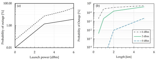 (a) Outage probability as a function of launch power per channel for case one (dashed line) and case two (solid line) using a fixed distance of 2 km; (b) Outage probability as function of fiber length using case 2 assumptions for 6 dBm launch power (dot dashed), 3 dBm (solid) and 0 dBm (dashed).