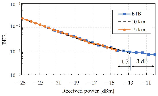 Figure 9 shows the BTB performance of one of the transmission wavelengths, 1291.14 nm, which is in line with [21]. The transmission performance after 10 km and 15 km is also shown for comparison. In this case, the DSP block dedicated to compensating CD is turned on. This shows the high-level performance of coherent DSP technology when applied to shorter transmission links. The only difference between these curves is the maximal received optical power, which reflects the impact of fiber attenuation.