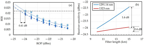 To simplify the coherent optical link and reduce the complexity, the dedicated CD compensation block is removed at the receiver. Therefore, it is assumed that the MIMO DSP block can compensate the effect of CD. As the receiver sensitivity is one of the most important factors, the MIMO filter taps are optimized with respect to the receiver sensitivity. Eleven to thirteen MIMO filter taps are used for this analysis, depending on the transmission length. This number optimizes the receiver sensitivity (RS) to −24.4 dBm. Figure 10a shows an example of the performance degradation induced by removing the dedicated DSP block to compensate for CD at 10 km. Here four iterations have been simulated per ROP and used to fit the exponential curve shown, when a dedicated CD compensation DSP block is used (dashed) and not used (dotted). An RS penalty of 0.41 dB can be observed in Figure 10a for 10 km at the transmission wavelength of 1291.14 nm. Figure 10b shows the RS as a function of transmission length. Here no CD compensation block has been used. The performance degradation increases linearly with length as the transmission distances exceed 10 km. For the 15 km transmission distance, the receiver sensitivity reduces to about −22.5 dBm at the 1291.14 nm wavelength, but to only −23.9 dBm for the 1323 nm wavelength. This is mainly because the transmission wavelength of 1323 nm suffers less from accumulated CD as it is closer to the ZDW.