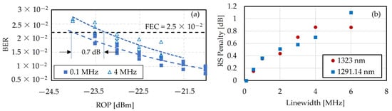 (a) BER without dedicated DSP Block for an LO laser with a linewidth of 0.1 MHz (dashed) and 4 MHz (dotted); (b) Receiver sensitivity penalty for the transmission wavelengths of 1323 and 1291.14 nm.