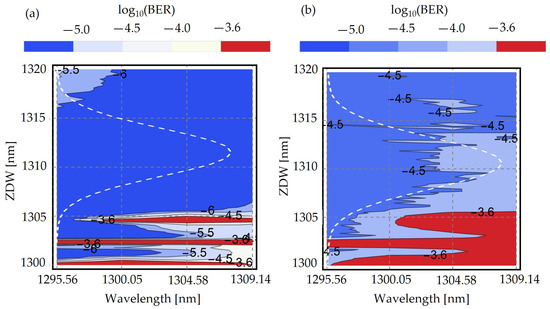 Contour plot exhibiting log10(BER) as a function of ZDW and four LWDM transmission wavelengths achieving a total of (a) 800 Gbit/s and (b) 1.6 Tbit/s aggregate transmission rate.