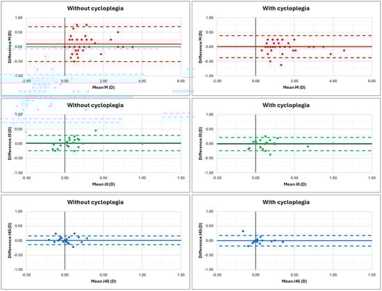Regarding the refractive variables (M, J0, and J45), there were no statistically significant differences between the optometrists, either without or with cycloplegia (p ≥ 0.05). Although no significant differences were observed, the 95% confidence interval of repeatability (r), which coincides with the 95% limit of agreement (95% LoA) from the Bland–Altman plots, of the spherical equivalent (M) was 0.25 D better with cycloplegia (r = 0.37 D) than without cycloplegia (r = 0.62 D). For the vertical (J0) and oblique (J45) components of astigmatism, this repeatability was similar both with and without cycloplegia, with a difference of just 0.03 D in both cases. The intraclass correlation coefficient (ICC) analysis showed results consistent with the repeatability findings, with slightly better ICCs for M and J0 with cycloplegia, but slightly worse for J45.