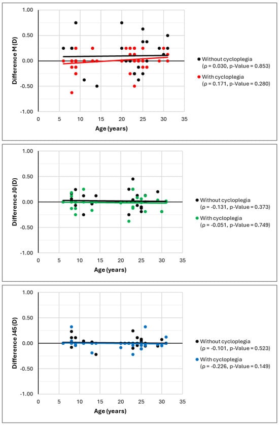 Lastly, to analyze whether there was a relationship between the participants’ age and the differences found between the optometrists for the refractive variables (M, J0, and J45), Figure 2 shows the scatter plots and linear correlations. No statistically significant differences were found for these parameters, as analyzed by Spearman’s correlation coefficients, either with or without cycloplegia (p ≥ 0.05).