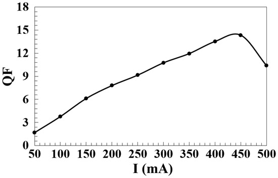 In Figure 3, the relationship between QF and the injection current (I) is crucial for optimizing the performance of a NAND logic gate using a single SOA followed by a DI. As the injection current increases, more carriers populate the active region of the SOA, which enhances the carrier recovery process after each input pulse. This replenishment of carriers leads to better signal quality, reflected in a higher QF, which is essential for reliable high-speed optical operations. In our design, we observe a significant improvement in QF, achieving a value of 10.40 at 500 mA. The increase in QF with the injection current is consistent with the equations governing the unsaturated power gain and saturation energy of the SOA. As shown in Equation (4), the injection current directly affects the carrier density in the active region, improving the recovery of carriers and enhancing the overall gain. The saturation power, Psat, as expressed in Equation (5), also increases with the injection current. This is because a higher injection current increases the carrier density, allowing the SOA to handle larger input power before reaching saturation. The increase in Psat enables the SOA to amplify the signal more effectively, contributing to better performance in high-speed operations [3]. The higher current also leads to more efficient carrier recovery, which in turn improves the overall gain and signal quality, essential for maintaining a high QF. However, an excessive injection current beyond 500 mA may lead to nonlinear effects, such as carrier recombination and thermal effects, which could degrade performance [20,21]. These effects can result in signal distortion, reduced gain, and even damage to the SOA. Thus, while increasing the injection current improves carrier recovery and gain, it must be carefully managed to avoid these negative consequences. The discrepancy between the 300 mA current in the table and the 50–500 mA range in Figure 3 arises because the table refers to a typical current for traditional NAND gate implementations using multiple SOAs, which require higher currents per SOA to achieve similar logic functionality. In contrast, the single SOA with DI configuration in Figure 3 is optimized to operate with a lower current range, providing a more efficient design with a competitive QF. This design reduces complexity, power consumption, and thermal load, making it a more streamlined and cost-effective solution compared to traditional approaches. The measurements presented in Figure 3 were obtained by progressively changing the SOA driving current while using a DCA equipped with a QF module. The QF values were monitored and recorded through histograms, which were then plotted against the SOA current to generate the curve shown in Figure 3. This approach provided a detailed evaluation of the relationship between the injection current and the QF, offering valuable insights into the performance and reliability of the NAND gate design at different SOA operating conditions.