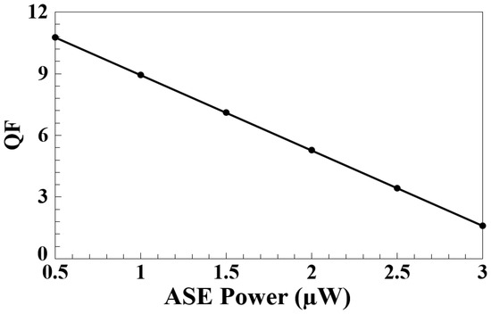 Figure 5. QF as a function of amplified spontaneous emission (ASE) power for a NAND gate utilizing a single SOA followed by a DI at 80 Gb/s.