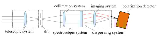 In order to ensure the acquisition of spectral information and polarization information at the same time, the system adopts the polarization spectrum integration design. Figure 1 is the schematic diagram of the polarization spectrum integration system. The telescope system images the oil spill image information from the sea surface into the slit. The two-dimensional image at the slit is segmented into one-dimensional spatial information, and then collimated by the collimation system, incident on the chromatic dispersion element. The chromatic dispersion element disperses the light of different colors, and then forms an image on the polarization detector through the imaging lens group, so as to obtain one-dimensional spatial information, one-dimensional spectral information, and four-dimensional polarization information. The polarization detector uses a micro-polarizer array covered on a CMOS sensor to separate polarized light in different vibration directions, so as to obtain four-dimensional polarization information. Finally, the spectrum and polarization information of the two-dimensional target are collected simultaneously by pushing and sweeping along the direction perpendicular to the slit. Finally, through a fusion algorithm, a fused image combining polarization and spectral information of the two-dimensional spatial image is obtained.