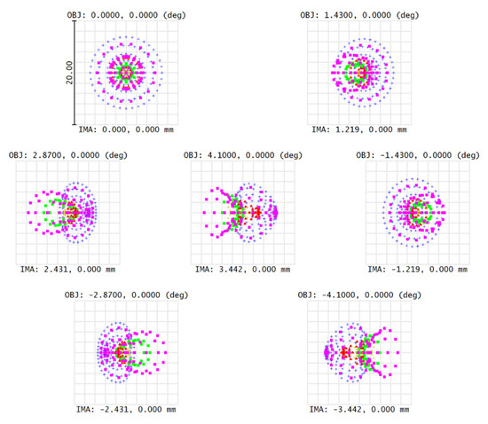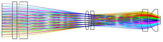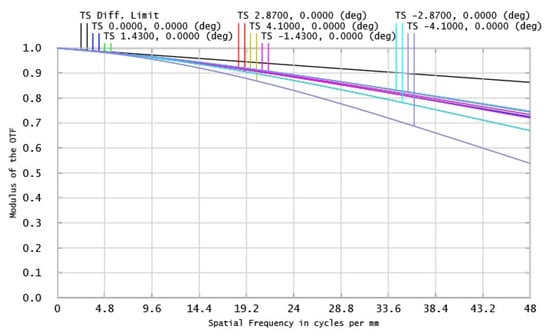 That is, the field of view angle of the telescope system is 2ω = 8.2°. Reducing the F-number can improve the ability of optical system to collect light energy, but it will also increase the difficulty of the optical system’s design. After comprehensive consideration, the F-number of the system is determined to be 3. The optical path diagram of the telescope system is shown in Figure 3, the point list diagram of the telescope system is shown in Figure 4, and the MTF curve of the telescope system is shown in Figure 5. It can be seen from Figure 5 that the MTF of the system is greater than 0.5 at 48 lp/mm, which is close to the diffraction limit.