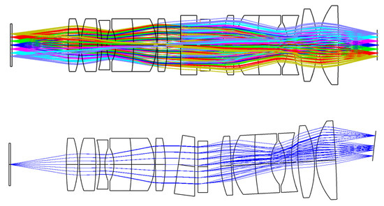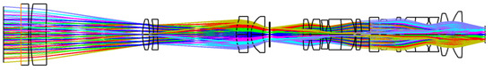 Due to the opposite spectral line curvature characteristics of prisms and gratings [10], a prism–grating (P–G) combination is employed as the dispersion system in this spectroscopic system [11]. The design must ensure both imaging quality and spectral performance. The collimation system and the imaging lens group are crucial components of the P–G hyperspectral imaging spectrometer. The collimation system serves to collimate the light from the incident slit into a parallel beam, which is then dispersed by the P–G combination chromatic dispersion system. Therefore, aberrations affecting beam collimation characteristics, primarily spherical aberration, must be corrected. The imaging system, on the other hand, focuses the dispersed light beam and forms an image on the image plane, necessitating the correction of all aberrations impacting imaging quality [12]. Additionally, to reduce design and manufacturing costs, the collimation system and the imaging system are designed with the same structure, where the collimation system adopts the inverted structure of the imaging system. This combined structure exhibits optical symmetry, facilitating the correction and elimination of system aberrations [13].