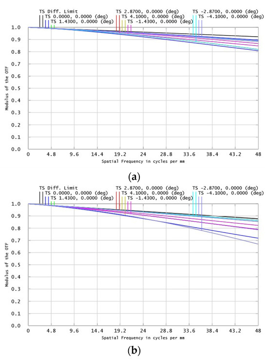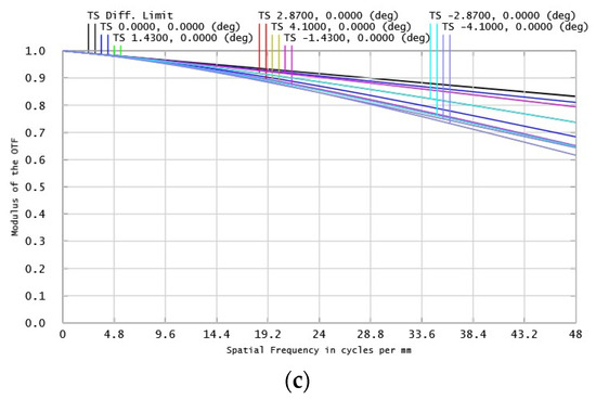 The spot diagram and the MTF of the complete system are shown in Figure 9 and Figure 10, respectively. The RMS radius sizes of each field of view of the complete system under 410 nm, 650 nm, and 900 nm are shown in Table 2.