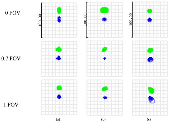 (a) Spot diagram of 410 nm and 412 nm. Green represents 410 nm, and blue represents 412 nm; (b) spot diagram of 650 nm and 652 nm. Green represents 650 nm, and blue represents 652 nm; (c) spot diagram of 898 nm and 900 nm. Green represents 898 nm, and blue represents 900 nm.
