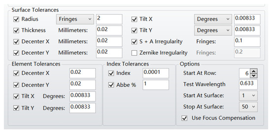 After the system design is completed, a tolerance analysis needs to be conducted to account for relevant errors that may arise during actual processing and assembly, and to assign appropriate tolerance components [14]. During this tolerance analysis process, reasonable tolerances must be allocated to all optical elements to ensure that the detection performance of the optical detection system meets the required standards while minimizing the costs of the optical components, assembly, and calibration, thereby optimizing the overall performance of the system [15]. Based on the actual processing levels referenced, the tolerances for the optical system are shown in Figure 12.