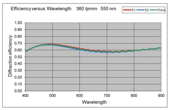 represents the diffraction efficiency of the transmission grating. The diffraction efficiency curve of the selected volume holographic grating at different wavelengths is shown in Figure 16: