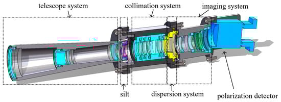 The collimation system is designed as the inverted structure of the imaging lens, thus the constructed imaging system has a lateral magnification of 1. The incident slit is located at the object-side focal plane of the collimation system, and the aperture stop is placed at the grating surface. The optical axis of the imaging system is inclined along the dispersion direction, and the image plane is inclined along the dispersion direction. The optical splitting system consists of a 360 lp/mm transmission grating and a refracting prism with an apex angle of 8.18°. The overall structure of the spectroscopic system shown in Figure 7:
