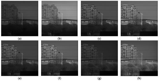 Comparison of typical spectral band intensity images before and after radiometric correction: (a) 410 nm pre-correction; (b) 410 nm post-correction; (c) 570 nm pre-correction; (d) 570 nm post-correction; (e) 730 nm pre-correction; (f) 730 nm post-correction; (g) 890 nm pre-correction; (h) 890 nm post-correction.