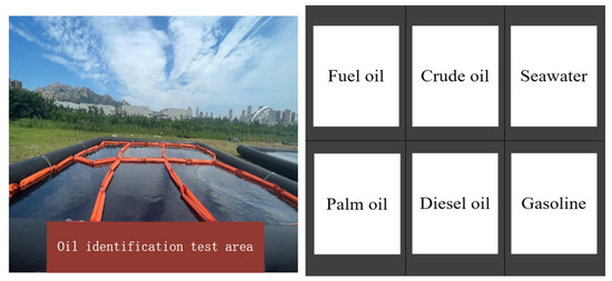 To verify the system’s ability to distinguish different types of oil on the sea surface, an experiment was set up for validation. An experimental site with a 6 m × 6 m seawater pool was set up, and the simulated oil types for the experimental targets included fuel oil, crude oil, palm oil, diesel, and gasoline. The layout diagram of the oil types is shown in Figure 22.