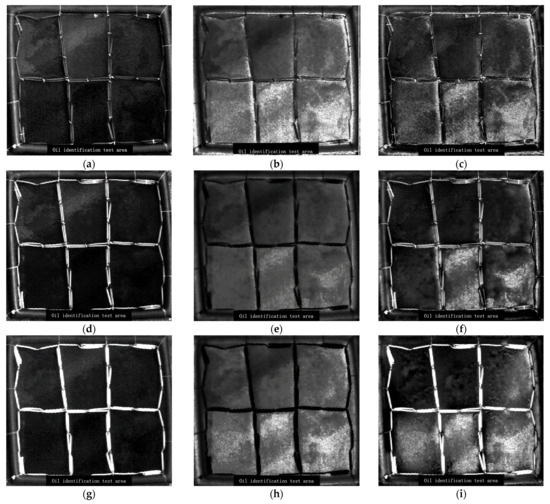 Utilizing the reflectance spectra of crude oil, fuel oil, diesel, palm oil, gasoline, and seawater, we derived the average remote sensing reflectance for these five representative oil types alongside seawater. The visible light bands exhibiting higher discrimination capabilities are identified as 435 nm to 470 nm, 550 nm to 570 nm, and 630 nm to 650 nm. Polarized images and spectral images within these specified bands were selected for fusion analysis, as illustrated in Figure 29.