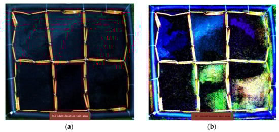Comparison of true-color images of oil spill: (a) original true-color image; (b) true-color image fused with polarization spectrum. Different colors represent different types of oil.