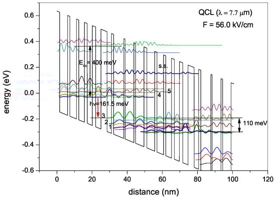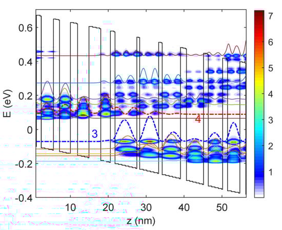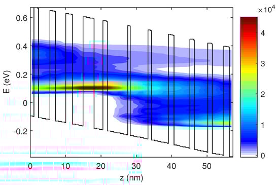 where is the in-plane momentum modulus. The potential comprises the position-dependent conduction band edge and the Hartree term. The interaction with the valence and remote bands is taken into account through the energy-dependent effective mass, , where is the non-parabolicity coefficient, and E is the total energy []. Equation (1) implies that at the output of NEGF formalism, one can get -resolved quantities. An example is shown in Figure 9, which presents the local density of states (LDOS) for the vanishing in-plane momentum, , in one QCL stage.