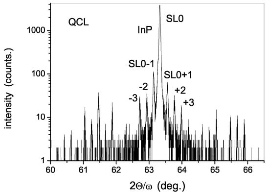 The QCL structure exemplary diffraction curve is presented in Figure 3. As can be seen, numerous narrow and intense satellite peaks are observed. This indicates that the period thickness and stoichiometric coefficients x and y of InGaAs and InAlAs active region layers were not changed during the growth process. The most intense SL0 superlattice and InP substrate peaks are observed in the angular range of 63–63.5 degrees. The heterostructure is also not relaxed. The regularly spaced peaks are the signature of a periodic structure. The XRD spectra, like those in Figure 2 and Figure 3, were measured along the radius of the wafers, from the same and different runs. They matched very well, confirming thus high uniformity of the grown structures, similar to those obtained for other QCL epi-wafers grown in this reactor (usually, the production yield of such devices, grown on all 3″ wafers from a single run, is above 90%).