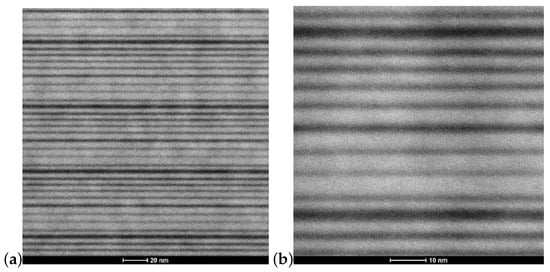 A greater challenge is the growth of more than thousand layers (which could take 14–18 h) with the same stable growth rate and, in consequence, with very well controlled thickness. TEM measurements in Figure 4 help to estimate the thickness and its repeatability if performed in several wafer places and analyzed for different cross-section regions. Due to the absence of net strain, the strain compensated wafers can be grown on InP substrates free of misfit dislocations. This technique is useful for the preliminary development.