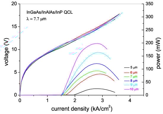 The investigated QCLs were placed on a temperature stabilized heatsink, including a thermistor and thermo-electrical cooler (TEC). The temperature of the device was kept at °C for light-current-voltage (L-I-V) measurements. These measurements were performed in a standard experimental set-up with a TE-cooled mercury cadmium telluride (MCT) detector. The room temperature light-current-voltage (L-I-V) characteristics of the devices with different waveguide widths are shown in Figure 6.