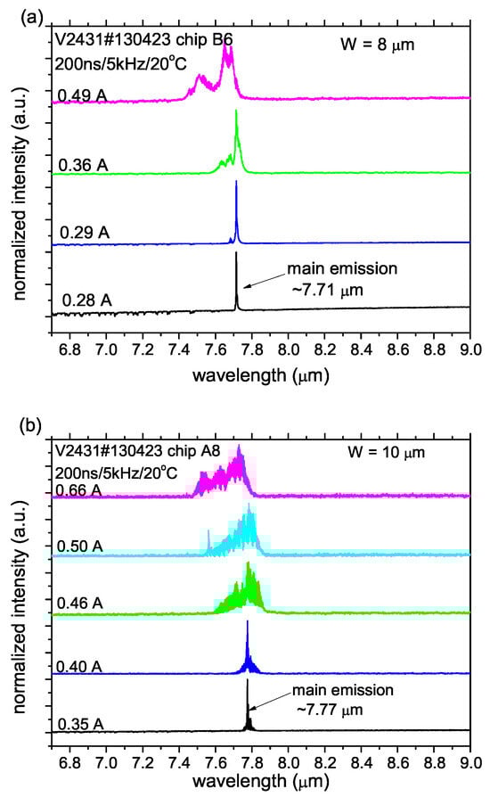 The emission measurements were performed using a Fourier transform infrared (FTIR) spectrometer (Nicolet 8700, Thermo Fisher Scientific, Waltham, MA, USA) with a liquid-nitrogen cooled photovoltaic MCT infrared detector placed inside the spectrometer. The spectral resolution of the spectrometer was 0.125 . The exemplary spectral characteristics of the devices with mesa widths: m and 10 m are depicted in Figure 7. Just above the threshold, the lasers operate single-mode on a single longitudinal mode and the measured wavelength excellently agrees with the designed value. The latter was obtained using band structure with abrupt IFs. The tapering (grading) described in ref. [] was not necessary to obtain this agreement, which confirms good IFs sharpness. As the current increases, the emission becomes multimode, in the sense of longitudinal modes, and at currents approximately equal to twice the threshold current, a higher order transverse mode appears.