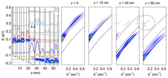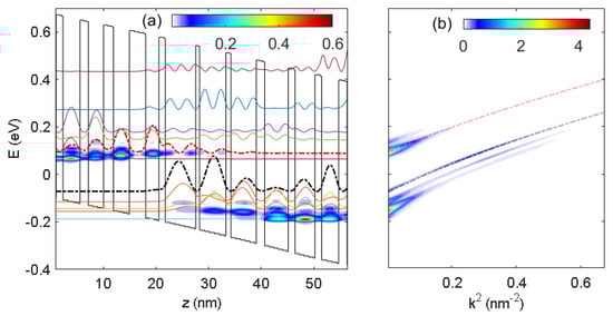 (a) Local density of electrons for (color graphs, unit ) for the case presented in Figure 9, (b) k-resolved density of electrons in active wells calculated by integrating z-resolved densities (like the one in the left panel) over spatial coordinate z, ranging from 18 nm to 39 nm (color graphs, unit ). Lines correspond to the eigenstates of the device; dashed-dotted lines refer to laser levels.