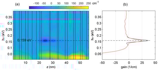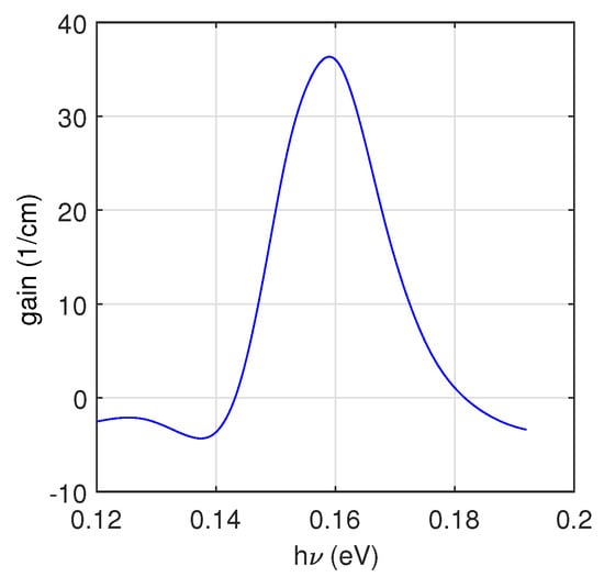 The positive gain emerges around meV (7.79 m), which is a tailored value. Its spatial location in the active region confirms that it originates from the transition between laser states. An important optical parameter is the FWHM of the gain spectrum. In semiclassical analyses, it is anticipated upon the intensity of the scattering processes. More advanced density matrix approaches rely on arbitrary assumed dephasing times, which impact FWHM. In the NEGF model, both these effects are accounted for. Our implementation accounts moreover for the broadening of the gain spectrum resulting from the variation of the intersubband gap at higher in-plane momenta, because the Hamiltonian in Equation (1) contains nonparabolicity both in longitudinal and in-plane directions. The value of FWHM estimated from the gain spectrum in Figure 12 is therefore very realistic and can serve as a reference for simplified approaches. The interesting feature that cannot be observed for the parabolic CB band models is the red-side narrowing of the spectrum resulting from high-k transitions. This interpretation can be inferred from k-resolved occupations of laser subbands depicted in the right panel of Figure 10. Opposed to low k values, for which populations of the subbands are inverted, the populations of high k values are normal, which leads to ISB absorption that “eats” the gain. Due to decreasing intersubband gap, this “consumption” happens at the red-side energies.