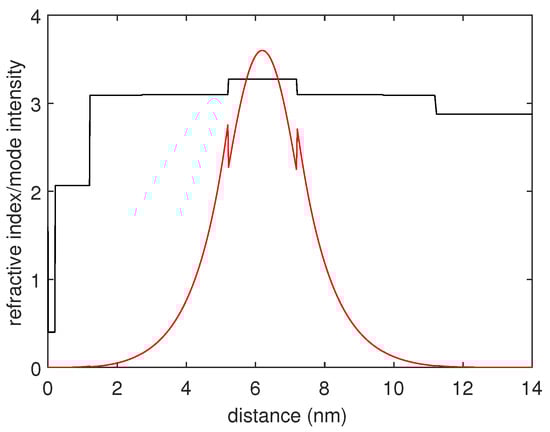 Intensity of TM0 mode (red line) and refractive index profile (black line) in the QCL waveguide. The refractive index in the core region was assumed as an average value for InGaAs and InAlAs materials, weighted by their volume contributions.