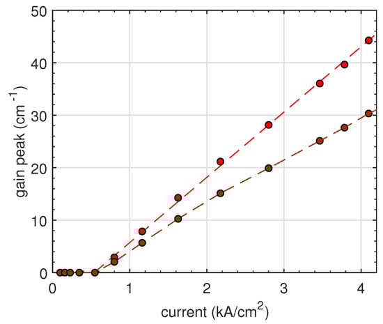 It is important to remember that the gain calculated with NEGF method is the net gain of active core, which already includes the ISB absorption. In this case, the threshold condition should then involve only the absorption losses of the empty waveguide, which were estimated as . This value was obtained with the Drude model of the waveguide materials, for which the parameters were taken from ref. []. The outcome of these calculations, which also provide the value of the confinement factor , is shown in Figure 13. For mirror losses of the 2-mm long cavity with uncoated facets, one eventually estimates . The threshold current, defined by the condition , can be estimated from the gain peak versus current characteristic shown in Figure 14. It was determined from the simulations for different bias. The value of the threshold current, read out from Figure 5, , agrees well with the experimental value 1.51 kA/ (see Table 2). Another useful quantity that one can extract from Figure 14 is the differential gain coefficient, , according to the full theory cm/kA.