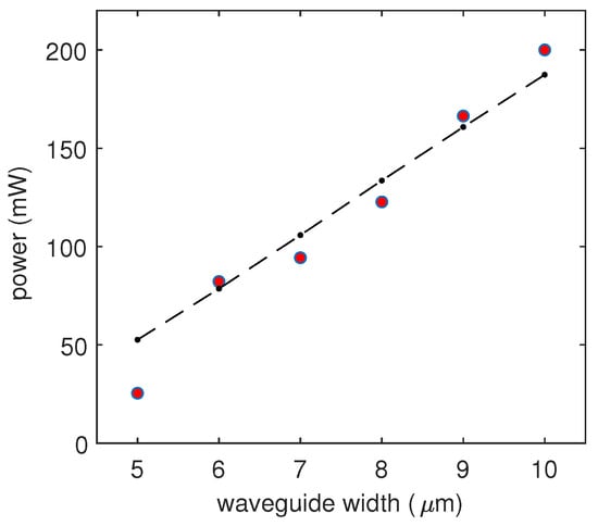 As expected, the power emitted by devices with different mesa widths decreases with decreasing volume of the active region, which is one way of power scaling []. The relationship is expected to be linear only for pulsed-operated lasers with the ridge width exceeding by some amount the emitted wavelength [,]. In the opposite limit (which is our case), another factor, that is the decrease of emitted power with the increase of waveguide losses for decreasing ridge width, must be accounted for. Power emitted by the laser is proportional to . In Figure 15, the emitted power of the lasers with different ridge widths is compared to the theoretical dependence which accounts for the volume and loss effects. The agreement is again very satisfactory.