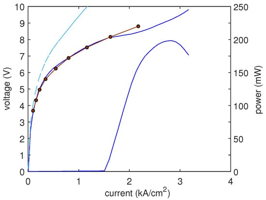 The calculated current-voltage characteristic differs much from the experimental one. This observation is, however, common for QCL devices due to parasitic effects, mainly the series resistance and Schottky contact voltage drop [,,,,]. Once these effects are taken into account, one gets a very good agreement between simulated and experimental characteristics (see Figure 16). In our simulations, the light-matter interactions were not accounted for, so the coincidence of the characteristic is expected (and observed) only in the subthreshold range. Due to this limitation, the NEGF simulations are useful for the estimation of the threshold current but not, e.g., the roll-off current or, in general, the electro-optics characteristics.