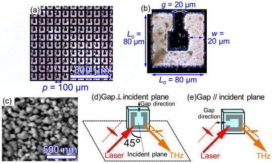 We used metal nanoparticle ink to make metallic nanostructures. Metal nanoparticle ink has been developed for printed electronics [38,39,40] and utilized to make metamaterials [41,42], photoconductive antennas [43,44], and quantum point contacts [45]. It was found that metal nanoparticle ink spontaneously forms random nanostructures by being baked, and so with this ink we can easily make metallic nanostructures in large area that can emit terahertz waves by laser excitation [25]. The use of silver nanoparticle ink has the advantage that there is no need for expensive and sophisticated nanofabrication techniques. Following the detailed process in [25], we spin-coated silver nanoparticle ink (ULVAC, Ag1TeH, Chigasaki, Japan) on a 0.5 mm thick fused silica substrate and baked it at 220 °C for 1 h to prepare a silver nanostructured film. Arrays of SRRs were fabricated by laser machining as follows: the film was moved by the programmatically controlled stage (Aerotech, ANT95-XY) and an output from a Ti:sapphire regenerative amplifier (Spectra-Physics, Solstice, Santa Clara, CA, USA; center wavelength 800 nm, pulse width ~50 fs) was focused onto it to blow away the unnecessary part of the film by laser ablation. Figure 1a,b show the image of one of our samples and the enlarged image of one SRR inside it, respectively. This sample, which we call S80 in the following, has an array of square-shaped SRRs with the outer length of each side Lo of 80 µm, the arm width w of 20 µm, and the gap width g of 20 µm. In addition to this sample, we fabricated samples containing SRRs with outer lengths Lo of 55 µm and 40 µm, which we call, respectively, S55 and S40 in the following. The period p of the SRR array of all three types of samples was identically 100 µm. The parameters of our sample are listed in Table 1. By using a scanning electron microscope (SEM), we confirmed that nanostructures were successfully formed on the silver film constituting SRRs (Figure 1c).