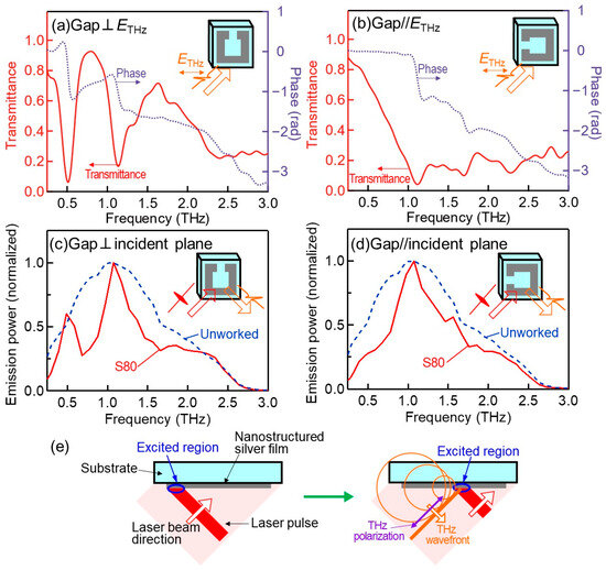 Figure 2a shows the results of the THz-TDS measurement for the S80 sample when the gap direction of the SRRs was perpendicular to the terahertz wave polarization, using a bare fused silica substrate as the reference. Around 0.50 THz and 1.1 THz, the transmission spectrum (red solid curve, left axis) had strong dips and the phase shift (purple dotted curve, right axis) showed a jump. The dip and phase jump around 0.5 THz originate from the lowest order of resonance of the SRR ascribed to the current circulating in the ring, whereas those around 1.1 THz are from the second-lowest resonance due to the half wave resonance in a sideline of the SRR [42,47]. The oscillation of the transmission spectrum above 1.1 THz is not only due to the higher-order resonances but also due to the scattering occurring above the diffraction frequency 1.1 THz, where c is the speed of light in vacuum, p = 100 is the period of the SRR array, ns = 1.97 is the refractive index of the fused silica substrate, and α = 45° is the incident angle [48]. When the gap of the SRR is parallel to the terahertz wave polarization, the terahertz transmittance and phase shift spectra of the S80 sample became as shown in Figure 2b. The transmission spectrum had a wide dip around 1.1 THz originating from the half-wave resonance of two sidelines of the SRR [47]. The oscillation in the transmission spectrum above 1.1 THz is again due to diffraction and higher-order resonances. The solid curve in Figure 2c shows the power spectrum of the terahertz wave emitted from the S80 sample when the gap direction of the SRRs was perpendicular to the incident plane of the excitation laser beam. The dynamic range was 40 dB at 1.1 THz. The signal-to-noise ratio at 1 THz, calculated by the emission power divided by its standard error of the seven iterative measurement results, was as high as 51, which demonstrates the reliability of the observed spectral shape. For comparison, the spectra emitted from the film without being etched by laser machining are also shown by the dashed curve. While the spectrum from the unworked film was broadly extended to ~3 THz with a peak around 1.0 THz, that emitted from S80 had two sharp peaks around 0.49 and 1.1 THz. These peak positions are close to the dip frequencies of the transmittance shown in Figure 2a, corresponding to the circulating current and half-wave resonance in the SRR as described above. On the other hand, when the SRR gap direction of S80 was parallel to the laser incident plane, the emitted terahertz spectral shape was changed to the solid curve in Figure 2d: the peak around 0.50 THz observed in Figure 2c disappeared and the peak around 1.1 THz became broader. These characteristics correspond to that of the transmittance spectrum in case the gap was parallel to the electric field (Figure 2b), which had a broad resonance dip around 1.1 THz.