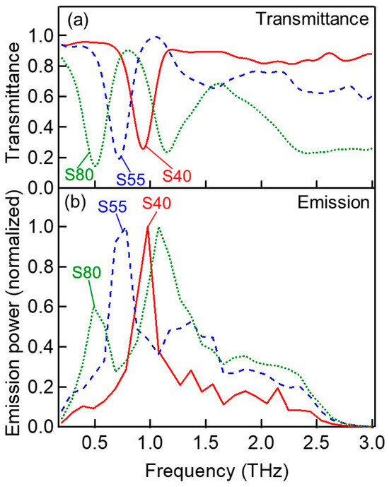 (a) Terahertz transmittance spectra and (b) emission power spectra of the SRR samples S80 (green dotted curve), S55 (blue dashed curve), and S40 (red solid curve).