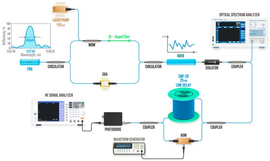 To avoid back reflection, an optical isolator was placed at the output of the system. The spectral characteristics were measured together with output power using an optical spectrum analyzer (OSA), namely, a Yokogawa AQ6370 (Tokyo, Japan), with a resolution of 20 pm. Mode beating was measured with a 5 GHz Thorlabs DET08CFC (Newton, NJ, USA) photodiode and an Agilent N9010A radio frequency (RF) signal analyzer. For precise linewidth measurement, the self-heterodyne technique [] was used. In this process, one of the arms of the Mach–Zehnder interferometer contained a 25 km delay line, and another arm contained an acousto-optic modulator (AOM) powered by an Agilent 33250A waveform generator (Santa Clara, CA, USA).