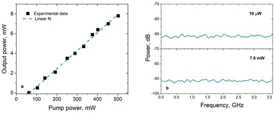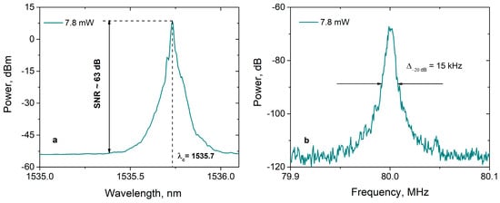 For the precise measurement of the linewidth, the self-heterodyne technique described in [] was used. Figure 4b shows the beat spectrum at the maximum output power: the linewidth at the −20 dB level was 15 kHz, which corresponds to the laser linewidth at half maximum, ≈0.75 kHz [].