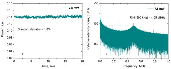 The standard deviation of the output power for a time interval of ~10 min was about 2% (Figure 5a). The relative intensity noise at a frequency of 0.5 MHz corresponded to −105 dB/Hz (Figure 5b). Thus, the spectral characteristics of an RDFB laser in this configuration are not inferior to those of distributed feedback fiber lasers (DFB lasers) based on FBGs with a phase shift []. Moreover, in terms of output power, the presented laser outperforms erbium DFB lasers with a characteristic output power of ~100 μW by an order of magnitude.