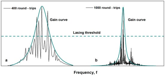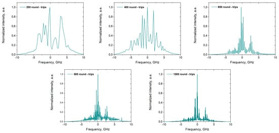 Generation was observed at the frequencies for which the losses are compensated by the gain. The envelope of the gain spectrum is not flat-top, and it is determined by the FBG and narrows with an increase in the number of roundtrips; these factors finally lead to single-frequency generation (Figure 7).