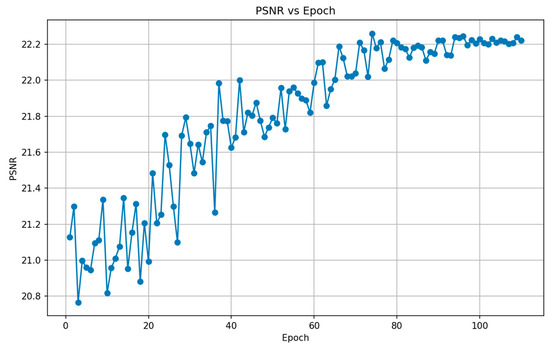 In order to ensure that the model is well trained while avoiding overfitting, we have implemented several key measures and metrics. Throughout the entire training process, we continuously monitor relevant parameter indicators, such as the loss value, training duration, and changes in learning rate, along with other performance metrics. We dynamically adjust the learning rate during training to prevent overshooting and enhance convergence. By tracking these metrics, if the performance on the training set ceases to improve or starts to decline, we can halt the training process. This helps prevent overfitting, ensuring that the model does not become too closely aligned with the training data. We have conducted multiple repeated training experiments, striking a balance between fitting the training data and achieving a high level of generalization. Ultimately, this ensures that our model is well trained and capable of effectively handling unseen data. During the training process, we record the PSNR value of the model after each epoch round, where the best model is defined as the generated model when the best PSNR value is reached. The following Figure 3 provides a detailed illustration of the variation in the PSNR value of the model with increasing epochs during the training process. It is obvious that the PSNR value in the early stage presents an overall increasing trend, and reaches the best value at the 74th epoch, when the value is 22.2603 dB, and the best training model is obtained at this time. Subsequently, as the training epoch increases, after the 80th epoch, the PSNR value will show a stable and convergent state, so that the point of maximum value represents the optimal model. We obtain the best model and it can be used in our image deblurring test.