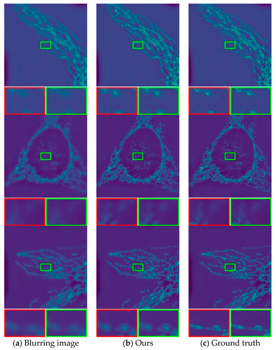 In the process of collecting the existing pCLE images, optical imaging systems face inherent limitations due to the physical characteristics of their components [4], encompassing factors such as the lens’s shape and material, as well as the shooting location. These constraints give rise to phenomena like scattering and refraction as light traverses the lens or reflector. In real-time image acquisition, vision sensors may introduce blurring, leading to changes in image resolution and contrast [5,6]. Therefore, the image background generally has the problems of dynamic blur or information loss, which bring great troubles to the realization of high-resolution and clear pCLE image [5], and seriously affects the analysis and follow-up research of image information. Consequently, the nature of image acquisition through the fiber bundle gives rise to several inherent characteristics and limitations necessitating novel and effective image preprocessing and postprocessing algorithms, ranging from image formation and enhancement to pathology detection and quantification [5]. The task of image deblurring holds significant importance in the realm of optical imaging, playing a crucial role in enhancing overall image quality [7].