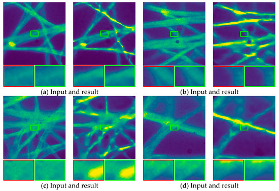 The significance of this performance gain extends beyond numerical metrics; it underscores the practical applicability of our proposed pCLE image deblurring method in real-world scenarios. The recovered images not only exhibit higher fidelity but also closely approximate the visual quality of the original scenes. This is a crucial aspect, especially in applications where image clarity and fidelity are paramount, such as in medical imaging or surveillance. Based on this, we use confocal laser endomicroscopy (pCLE) to capture real biological images and test the deblurring effect of our proposed method. Our pCLE imaging samples are fluorescently dyed tissue paper. We actually evaluate the deblurring effect of 54 pCLE images. Our pCLE images are obtained through real-time imaging with fiber-bundle endomicroscopy. Due to various physical conditions, absolute ground-truth images are not available for these images. Since there is no ground truth, we visually demonstrate the deblurring results obtained by our method through the pCLE deblurring images in Figure 6. Figure 6 shows the deblurring results of four groups of pCLE images. The left and right sides of each group are the acquired input images and the optimized result images, respectively. In each set of optimized result images, clear restoration of crucial highlighted areas is visible. Moreover, our proposed method proficiently alleviates the overall blurring of the images, showcasing its effectiveness in enhancing visual clarity. It can be seen that our method can really achieve a certain degree of deblurring effect, which is of great significance.