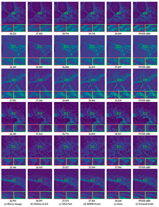 To better evaluate the proposed algorithm’s performance, we recovered images on our dataset and compared them with other algorithms, including Deblur-GAN [26], DGUNet [31], and MIMO-Unet [32]. An intuitive comparison is shown in Figure 7. Figure 7f are the ground truth images from the test set. Then we first added various fuzziness to obtain Figure 7a, and we used Figure 7a as input for each algorithm to obtain each of the remaining images in Figure 7, respectively. Compared with the previous image processing methods, it can be seen that this method can obviously recover the spatial details of W2S images better. The PSNR and SSIM values calculated for each image and the ground truth image are listed below the image, respectively. The PSNR and SSIM of the proposed algorithm exceeded that of Deblur-GAN, DGUNet, and MIMO-Unet. The tangible performance gains, quantified through metrics such as PSNR and SSIM, underscore the efficacy of our approach in significantly enhancing image quality [33]. Notably, the visual results further emphasize the ability of our method to produce images that are not only sharper but also more faithful to the original scenes [34], crucial qualities in applications such as medical imaging, surveillance, and other domains where precision and accuracy are paramount.