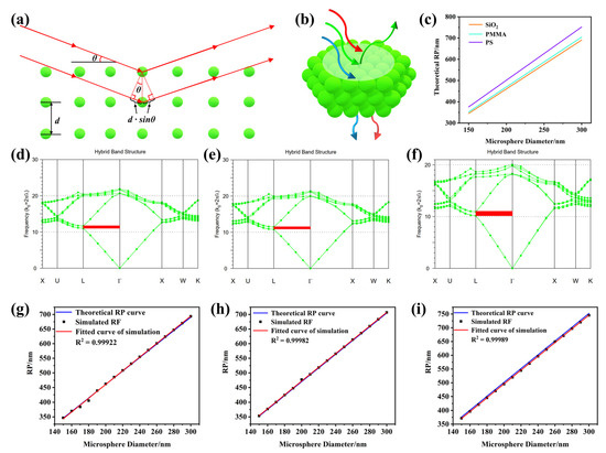 (a) The Bragg diffraction of the PCs; (b) the selective reflection of the PCs; (c) theoretical diameter–reflection peak lines of the SiO2 PCs, PMMA PCs and PS PCs; the Rsoft–Bandsolve simulation of 240 nm (d) SiO2 PCs, (e)PMMA PCs and (f) PS PCs; the comparison of theoretically calculated and simulated reflection peaks (g) SiO2 PCs, (h) PMMA PCs and (i) PS PCs.