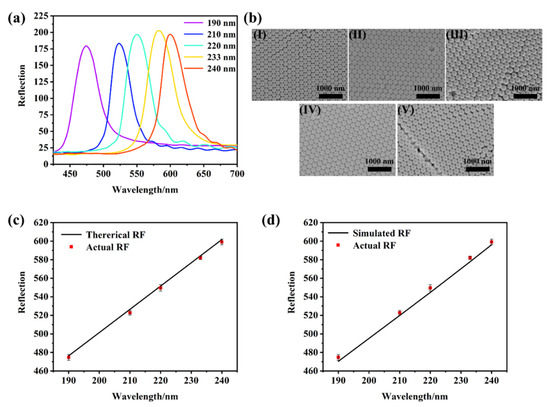 (a) The reflectance spectrum of the PS PCs and (b) the SEM at (I) 190 nm, (II) 210 nm, (III) 220 nm, (IV) 233 nm and (V) 240 nm; (c) the comparison of actual and theoretical reflection peaks; (d) the comparison of actual and simulated reflection peaks.