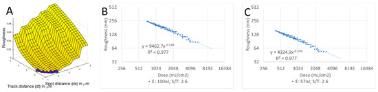In Figure 1A, a three-dimensional plot for the laser energy E1 = 100 nJ (with ETh1 = 65 nJ) with ds in µm as the x axis, dt in µm as the y axis, and the roughness as the z axis is shown. A univariate plot of the roughness in relation to the treatment dose for a constant pulse energy, via modification of ds, dt; such that ds/dt = constant is presented in Figure 1B for the laser energy E1 = 100 nJ (with ETh1 = 65 nJ) and Figure 1C for the laser energy E2 = 57 nJ (with ETh2 = 47 nJ).