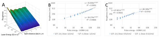 As it can be inferred from Figure 2B,C and derived from the equation for bubble size, roughness depends on the geometry of a single bubble and the respective spot and track distances (i.e., the overlap along and across the pathway). Mathematically, this means that it is dependent on the factor k, and the amount of energy exceeding the LIOB threshold (E − ETh), and independent of the actual LIOB threshold.