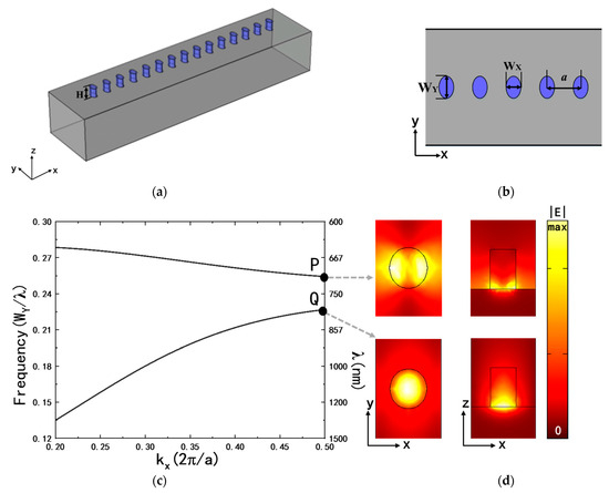 (a) Schematics of the surface plasmonic PNC structure. H = 150 nm. (b) Partial top view of PNC structure. WY = 180 nm, WX = 140 nm, and a = 280 nm. (c) Dispersion relation of the PNC structure. (d) Top view and front view of electric field modules (|E|) of the modes corresponding to P and Q points in (c).