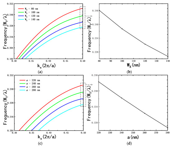 The band edge frequency and the position of the band gap can be tuned by changing the structural parameters of the PNC. In the following, when the major axis WY and the height H remain unchanged, the minor axis WX of the elliptical cylinders and the periodic constant a of the chain are adjusted to optimize the band structure. Figure 2a shows the dispersion relation curves for different WX values ranging from 80 to 140 nm when a is kept constant at 280 nm. It can be seen that the band edge frequency gradually decreases with the increase in WX, as shown in Figure 2b. Figure 2c demonstrates the dispersion relation curves for different a values ranging from 220 to 280 nm when WX is kept constant at 140 nm. Similarly, it can be found that the band edge frequency decreases as a becomes larger, as shown in Figure 2d.