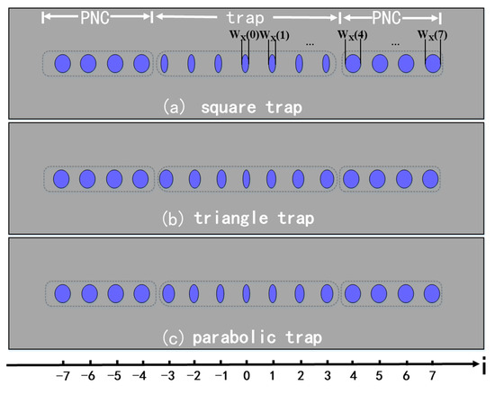 Based on the results of Section 2, we designed three different SPT structures by engineering the particle sizes while keeping the periodic constant a = 280 nm unchanged, as shown schematically in Figure 4. Typically, an SPT structure consists of three segments: the two end segments are PNC structures and the middle segment is the trap region. The PNC segments act as reflectors for the cavity and the wavelength of the cavity mode should lie in their band gap. The PNC segments in the three structures are identically composed of four nanoparticles. Their differences lie in the trap segments of the three SPT structures. Figure 4a shows the square trap which is made of seven identical nanoparticles, and their particle size is smaller than that of the PNC segments. According to Figure 2a, this trap segment can support a mode with a wavelength shorter than the band edge of the PNC segments. Figure 4b shows the triangle trap which is made of seven nanoparticles whose parameter WX varies linearly [41]. Figure 4c shows the parabolic trap which is made of seven nanoparticles whose parameter WX varies parabolically [42]. The sizes of the nanoparticles in the two traps of Figure 4b,c are all smaller than that of the PNC segments, and therefore these two traps can also support modes with a wavelength shorter than the band edge of the PNC segments. In the above three SPT structures, the parameters of WY = 180 nm, H = 150 nm, and a = 280 nm are kept constant. The position of the nanoparticle in the chain is denoted by the letter i. The position number of the middle particle is set to i = 0. WX(i) denotes the parameter WX of the i-th particle counted from the middle one. The detailed parameters of the minor axis WX of the three SPT structures are summarized in the following equations.
